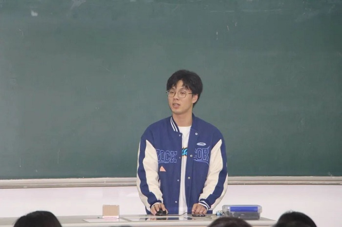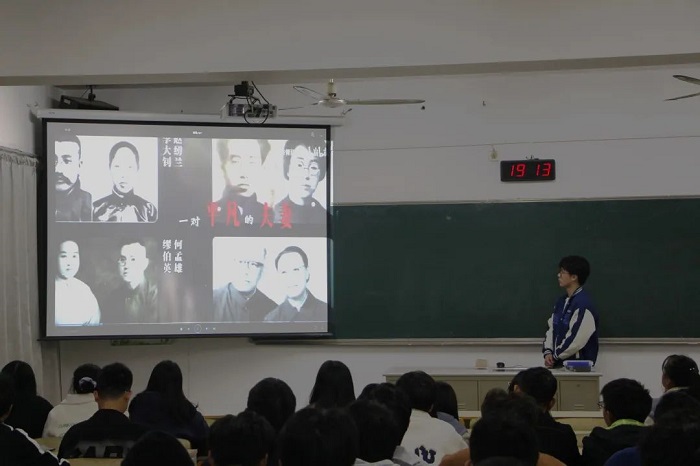 11月27日,“材料榜YOUNG”青年讲师团党的二十大精神宣讲活动暨新思想公开课在博学楼412教室举行。学生党支部成员、2022年国家奖学金获得者谈志东为全体大一新生进行党的二十大精神宣讲。