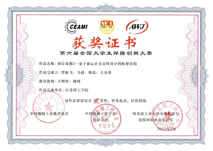 全国大学生焊接创新大赛是面向材料成型及控制工程等相关专业的科技竞赛。我院领导和材控系对此高度重视,接到大赛通知后,立即组织队伍积极准备比赛,对参赛作品进行指导、遴选,并对参赛学生进行培训。经过大赛组委会初选,我校参赛作品晋级全国决赛。后经决赛现场性能测试、学生现场答辩、专家评审等激烈比赛环节,我院材料成型及控制工程专业学生贾振飞、马超、杨磊、王金络完成的固定命题作品《基于面心正交点阵设计的桁架结构》荣获大赛二等奖。该作品在焊接结构与连接方式等方面均有创新,充分展示了我院学生坚实的理论基础、实践能力、创新意识与团队合作精神。