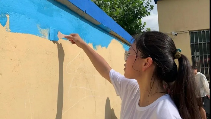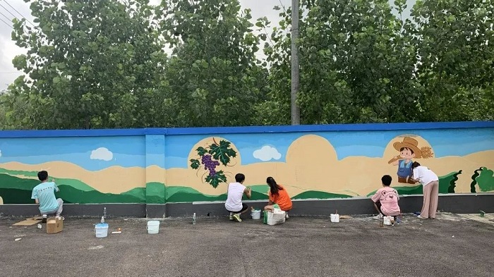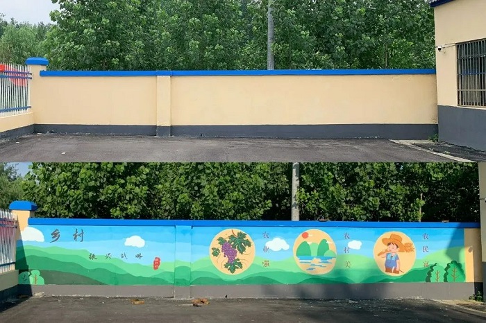 “艺”绘乡村 ,添笔新彩。旗杆村的党群服务中心坐落在乡间小路旁,院内一堵长达9米的围墙虽维护得干净质朴,但也略显单调。同学们冒着高温酷暑,完成了乡村振兴主题墙绘的创作,为村庄增添了一抹靓丽的色彩。