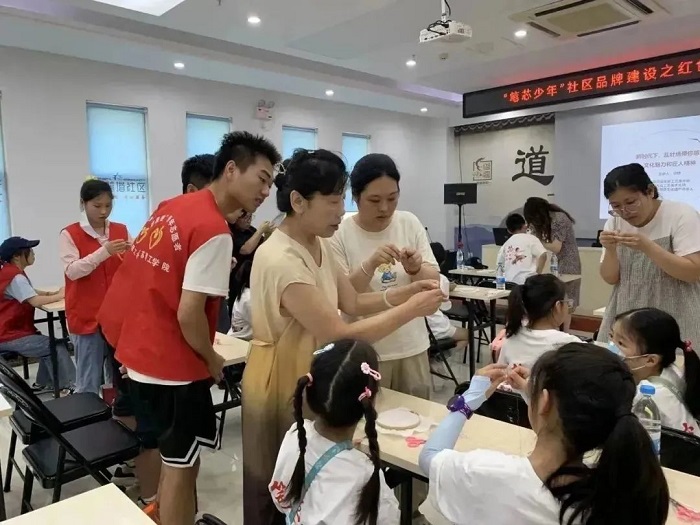 在文笔塔社区党群服务中心,江苏省工艺美术大师、常州非遗乱针绣第三代传承人狄静为现场的“笔芯少年”们详细讲解了乱针绣的历史与特色、构图与针法,小朋友们跟着大师认真学习知识,细心请教技法,亲身体验制作,中国传统技艺在一针一线的穿引中接力传承、焕发生机。