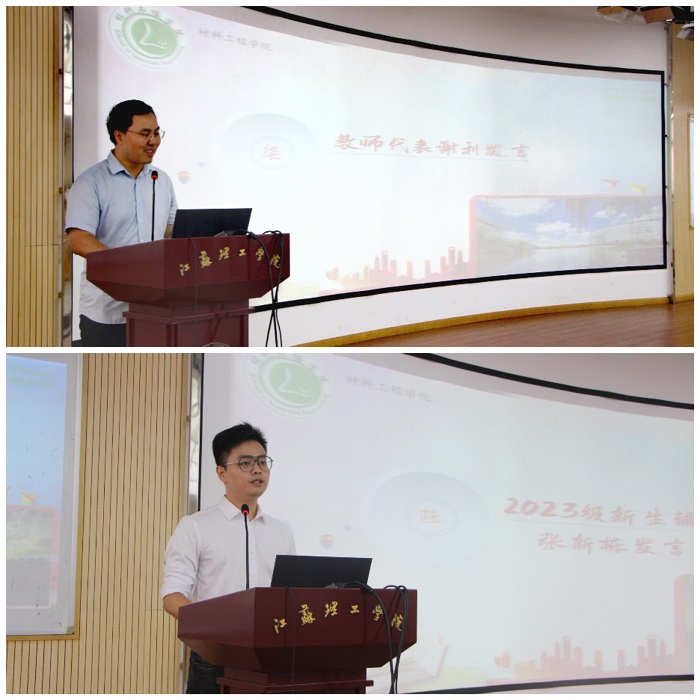 老生代表、院学生会主席高俊香和新生代表、23金属2付煜天同学分别发言。高俊香回顾了两年的大学生活,提出大学只是人生新阶段的起点,鼓励新生树立远大理想,结交人生伙伴,攀登更加险峻的高峰。付煜天倡议广大新生尽快适应大学生活,定下奋斗目标,成为适应社会发展的复合型实用人才,用青春拼搏无悔。