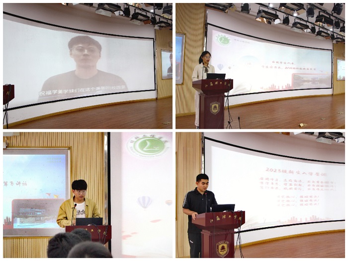 2023届毕业生代表金广鉴、陆天明、张雨柔、谈志东分别通过大屏幕向全体新生送上美好祝愿,激励新同学奋发向上,创造属于自己的辉煌。