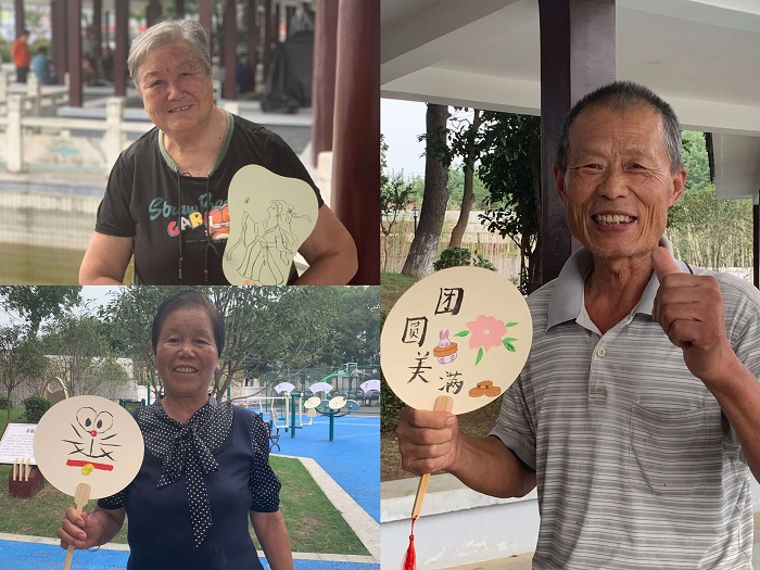 精巧的手工团扇、有趣应景的主题贴纸,吸引了众多身影驻足围观。“小姑娘,可以再帮我画一只兔子,写两句诗吗?”接到爷爷奶奶们的“私人订制”需求,同学们现场拾起了画笔,为大家现场作画,得到大家一致点赞。