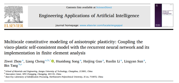 参考格式:Ziwei Zhou, Liang Cheng, Huaidong Song, Haijing Guo, Ruolin Li, Linyan Sun, Bin Tang, Multiscale constitutive modeling of anisotropic plasticity: Coupling the visco-plastic self-consistent model with the recurrent neural network and its implementation in finite element analysis, Engineering Applications of Artificial Intelligence, 2025, 161(B):112249.
