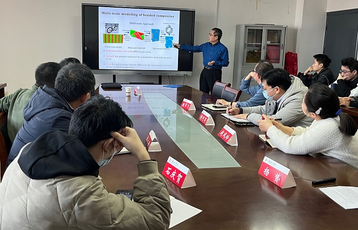 Chen Zhong教授系统阐述了编织复合材料在航空航天、高端装备等领域的重要应用价值,重点剖析了该类材料多尺度力学模拟研究中面临的核心瓶颈。他指出,精准表征编织复合材料的力学特性,关键在于构建可同步描述细观纺织构型与宏微观损伤演化机制的一体化理论框架。Chen Zhong教授随后详细介绍了其团队自主研发的多尺度建模方法体系,分享了该方法在模型构建、参数校准及实验验证中的关键技术与实践经验。在互动环节,与会师生围绕模型精度优化、复杂工况适配、工程化应用前景等核心问题开展深度学术研讨,现场氛围热烈。